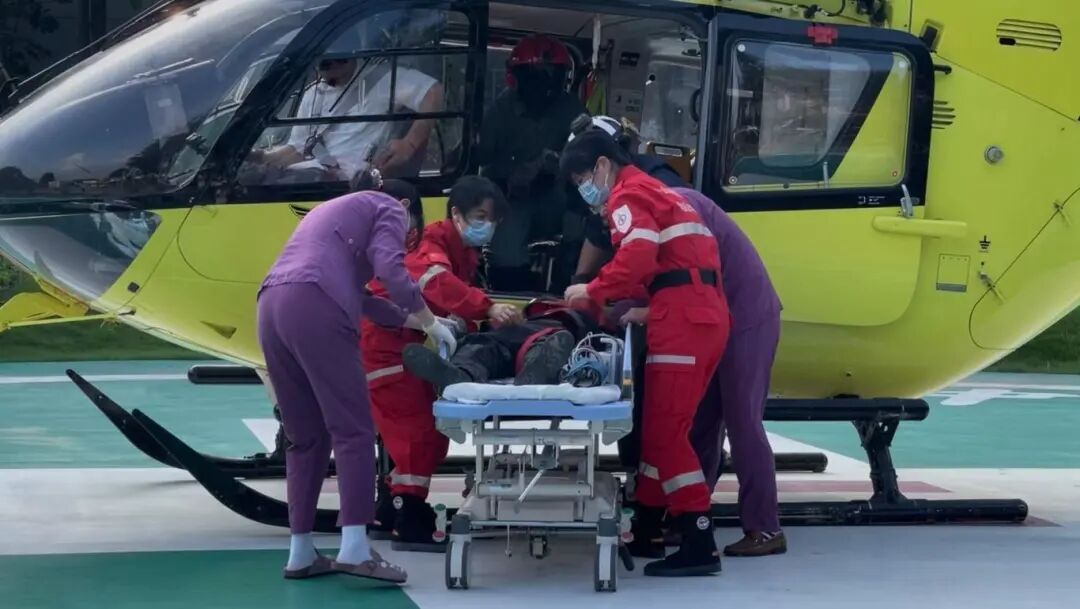 16:15,直升機平安抵達中山大學附屬第七醫院;16:17,患者被交接至急診與災難醫學中心;16:18送入病房。隨后,ICU、急診等多部門醫護人員聯合對患者展開救治。