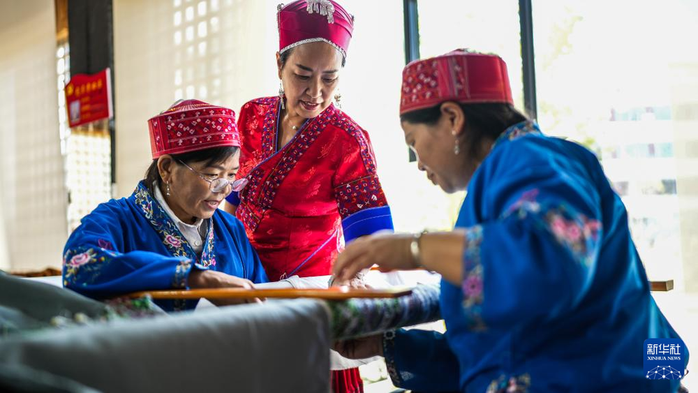 龍祿穎(左三)在位于貴州省施秉縣的舞水云臺非遺工坊進行刺繡創作(10月10日攝)。