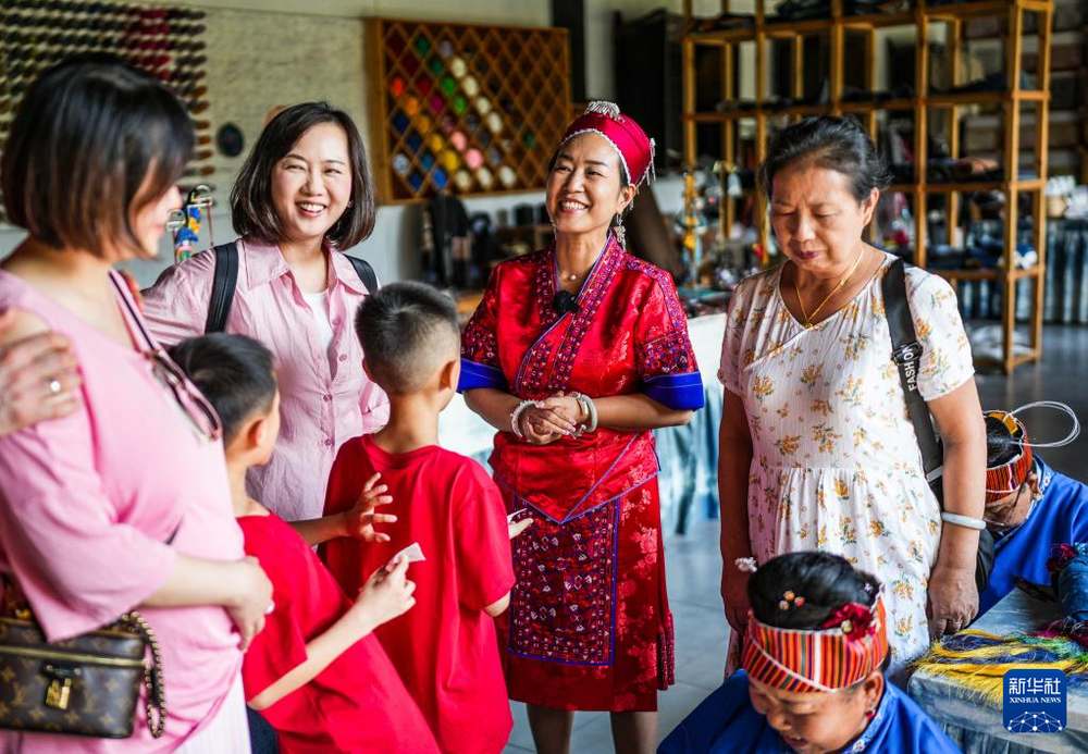龍祿穎在位于貴州省施秉縣的舞水云臺非遺工坊和游客交流(10月10日攝)。