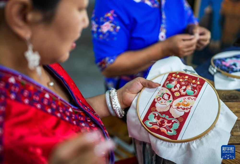 龍祿穎(中)在位于貴州省施秉縣的舞水云臺非遺工坊進行刺繡創作(10月10日攝)。