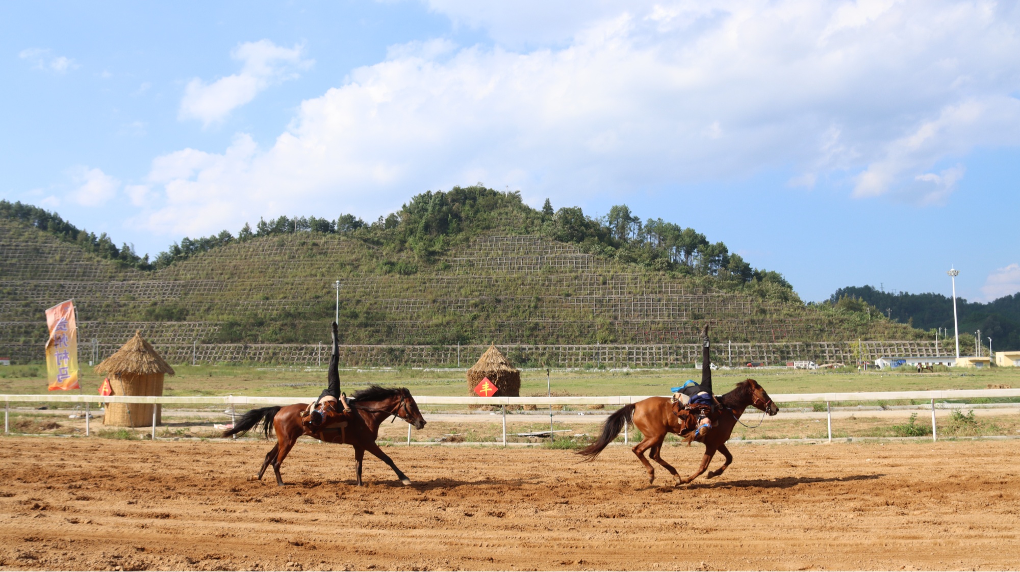 比賽中,騎手們駕馭駿馬馳騁,時而并駕齊驅,時而后發趕超,馬蹄聲與歡呼聲交織回蕩。賽馬間隙,《中華水鄉》《苗族舞錦雞舞》《圖騰鳥》等民俗展演輪番上演,6人疊羅漢、馬背站立等馬術特技更讓現場掌聲不斷。
