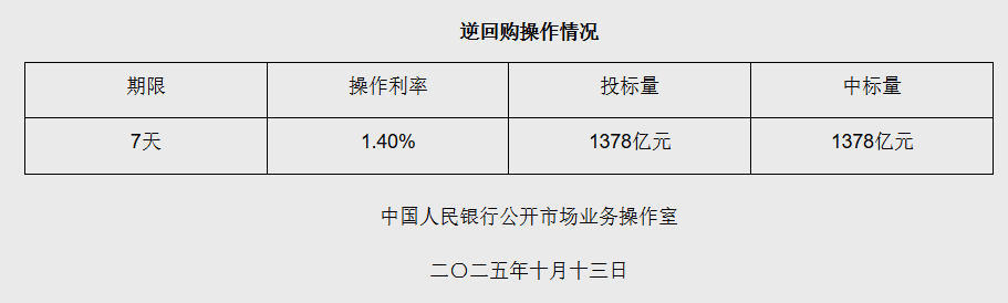 中新網10月13日電 據央行網站消息,2025年10月13日中國人民銀行以固定利率、數量招標方式開展了1378億元7天期逆回購操作。具體情況如下: